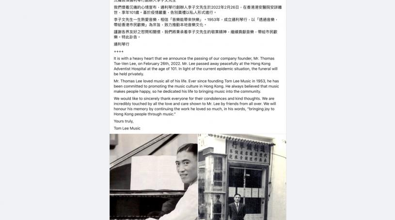 通利琴行在社交網站發訃告,創辦人李子文上月26日離世,享年101歲。由於疫情嚴重,告別奠禮以私人形式進行。