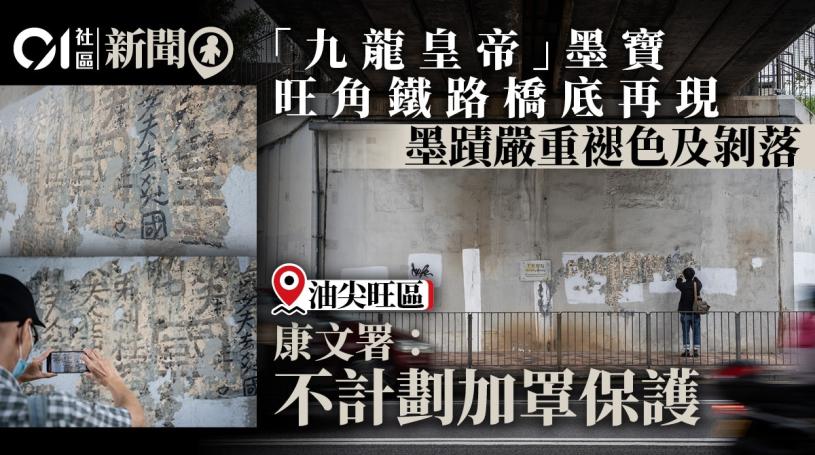 康文署發言人昨晚回應,位於界限街及基堤道交界鐵路橋底牆身表面的疑似墨蹟,署方已進行實地視察,並進行了詳細的拍攝記錄。初步發現墨蹟已呈嚴重褪色及剝落,加上墨蹟位於鐵路天橋下方柱墩,柱墩上方繫有金屬接水槽,牆身表面有污水從水槽滲漏後留下殘餘物的痕跡,故不建議為墨蹟加設保護罩,以免加速濕度上升,導致蟲和霉菌生長,造成進一步的破壞。